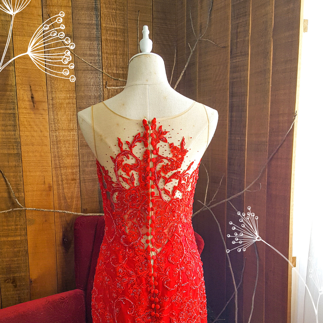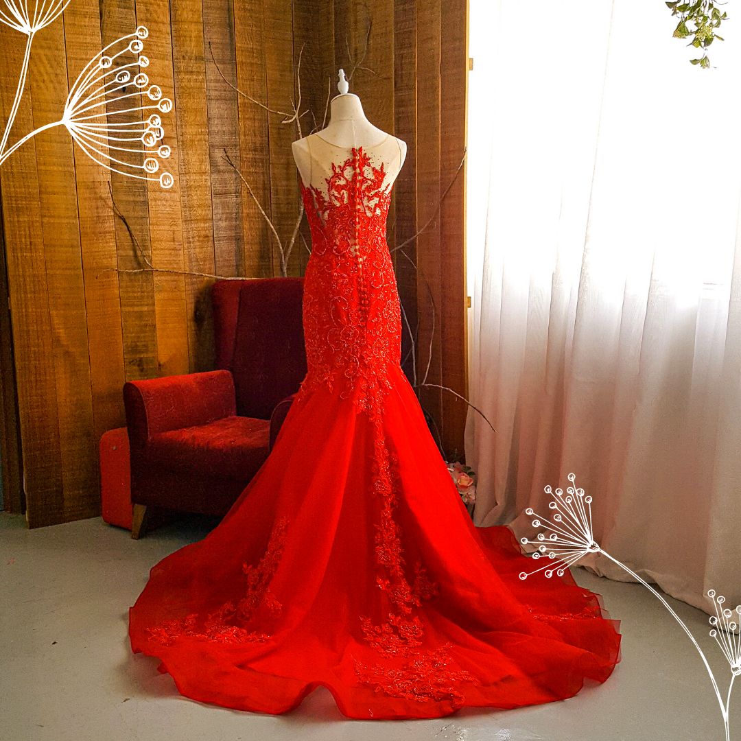 204LLE02 Maddie Red Illusion Deep V Button Back Trumpet a Bridal event wedding dress reception rental custom make Dinner