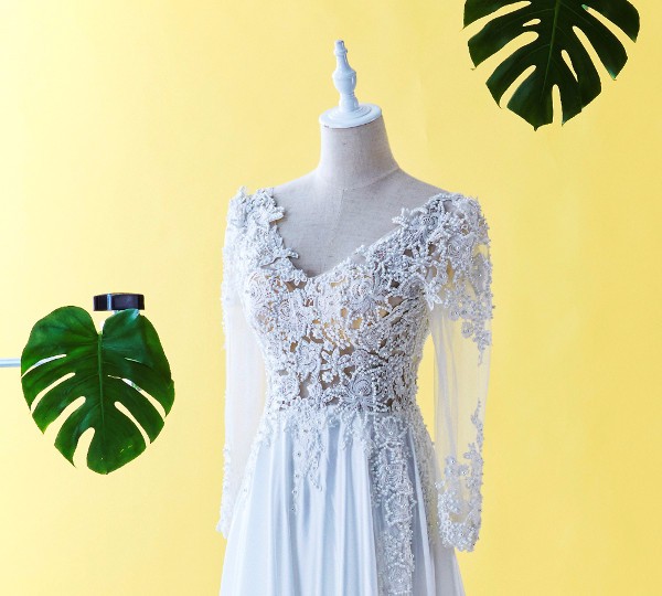 Long sleeves weding dress in elegant A line style. Illusion neckline embroidered in Italian Alencon lace, teamed with luscious soft silk satin skirt that are flowy and floaty. There is a thigh height slit to add a hint of sexiness to the dress. Can be accessorized with a sparkling Swarovski crystal and rhinestones belt.