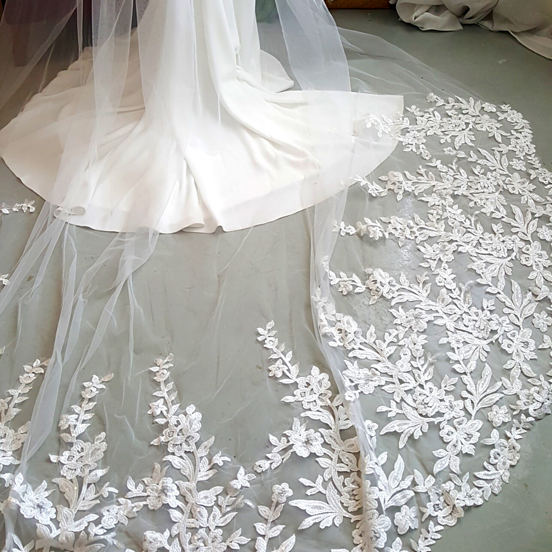 Type of Lace: French Guipure Lace with sparkly sequins, Full Lace along the train of the veil, front is clear
