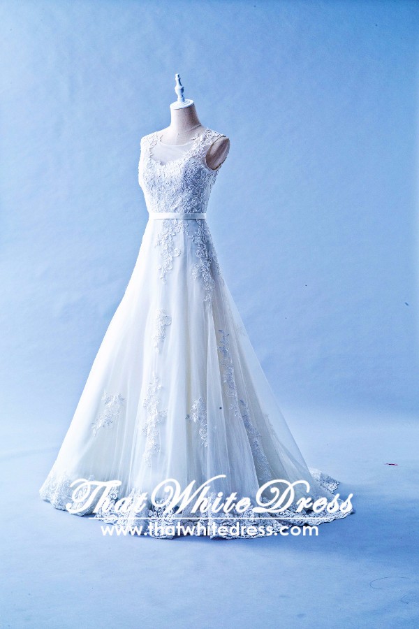 1502W13 XJ Illusion Neck Cap Sleeves Lace Train A line