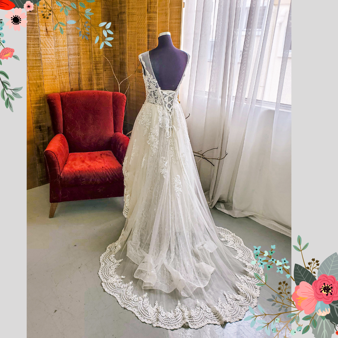 605LL01 LL Illusion Lace Neckline Alyssa Short Dress Long Train Wedding Dress rental