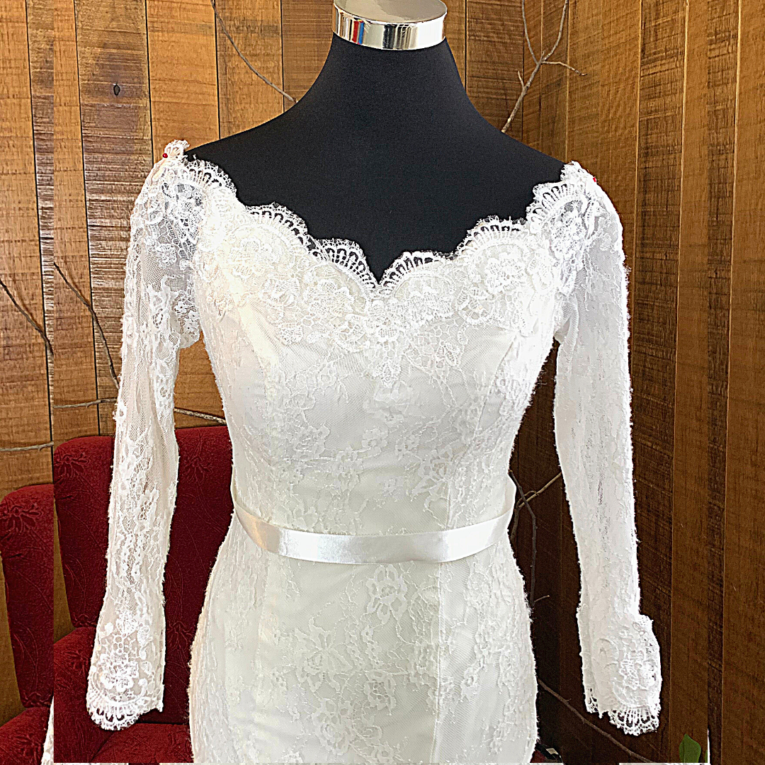 Long sleeves wedding dress with demure off shoulder neckline in Full French Chantilly lace.