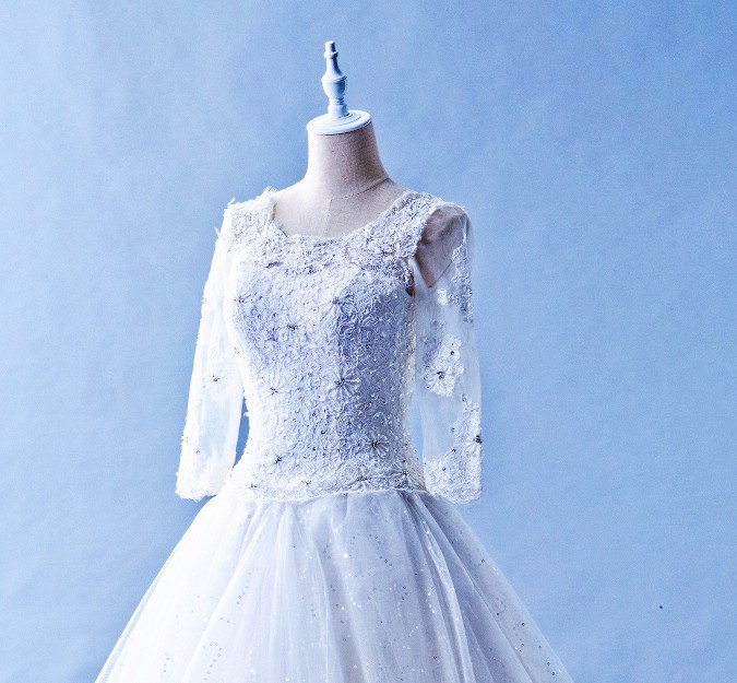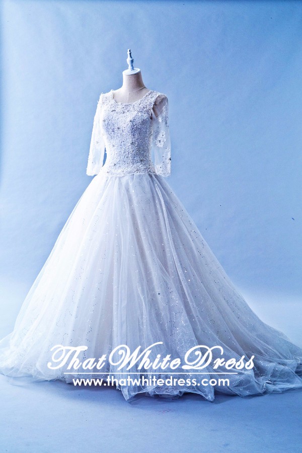 Cute fluffy princess style wedding dress in 3/4 sleeves. It has a subtle sparkle due to the hidden sequins layer underneath the puffy skirt, adding a understated glamour to the already elegant dress. Perfect for wedding dinner march in dress.
