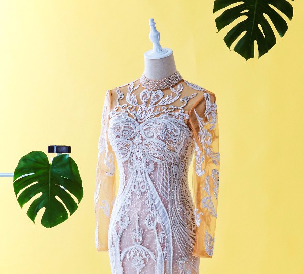 Champagne colour Long sleeves weding dress in trumpet with illusion Spanish embroidered lace. Fully beaded and sequined to maximise the glamour of the dress. Perfect for wedding reception in the evening.