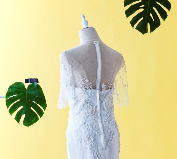 Beautiful zip back details. Can be teamed with a detachable long sleeves inner garment to convert it into a conservative covered back dress suitable for church wedding, muslimah wedding/majlis perkahwinan, or nikah.