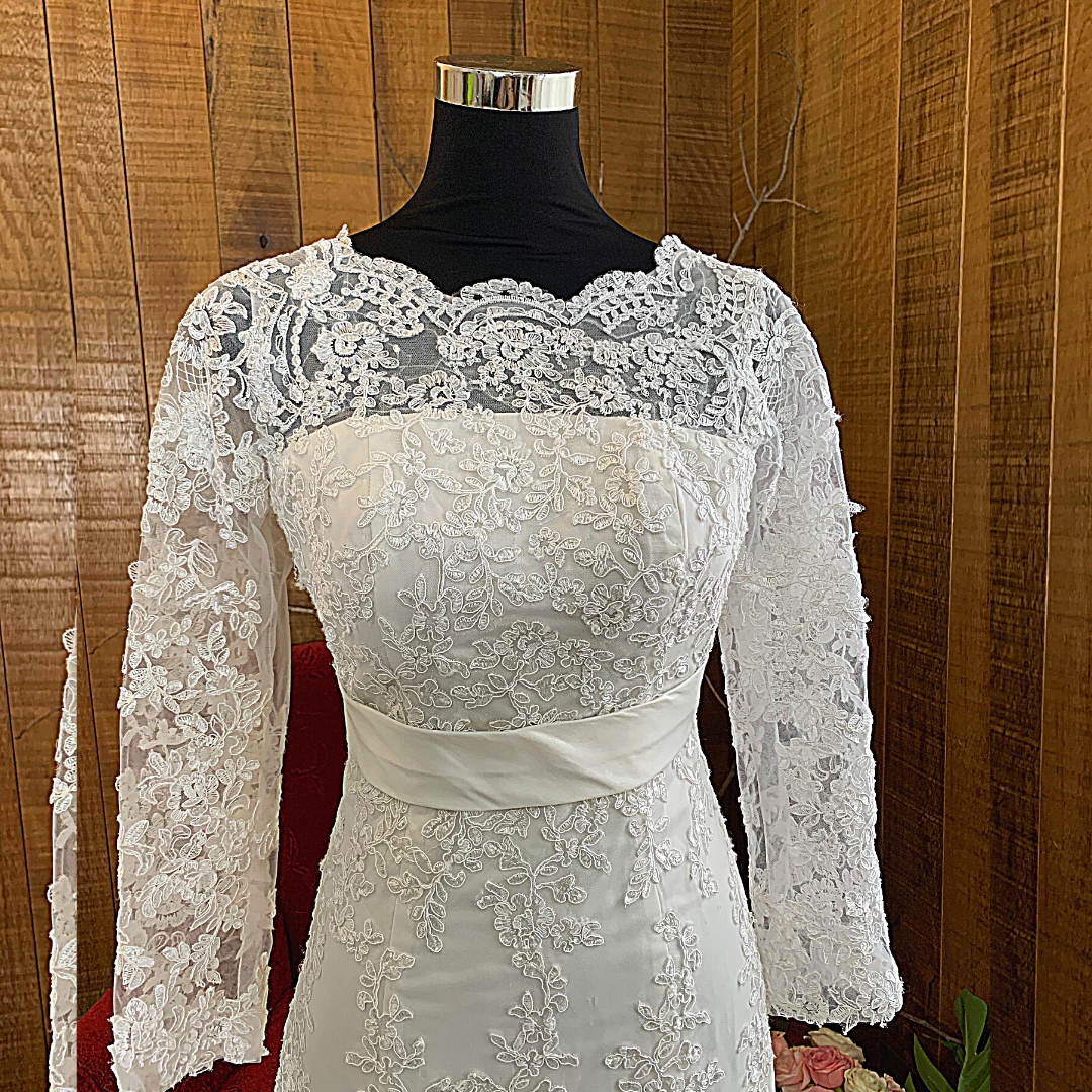 Long sleeves wedding dress with elegant bateau straight boat neck neckline in Full French Alencon Corded lace.