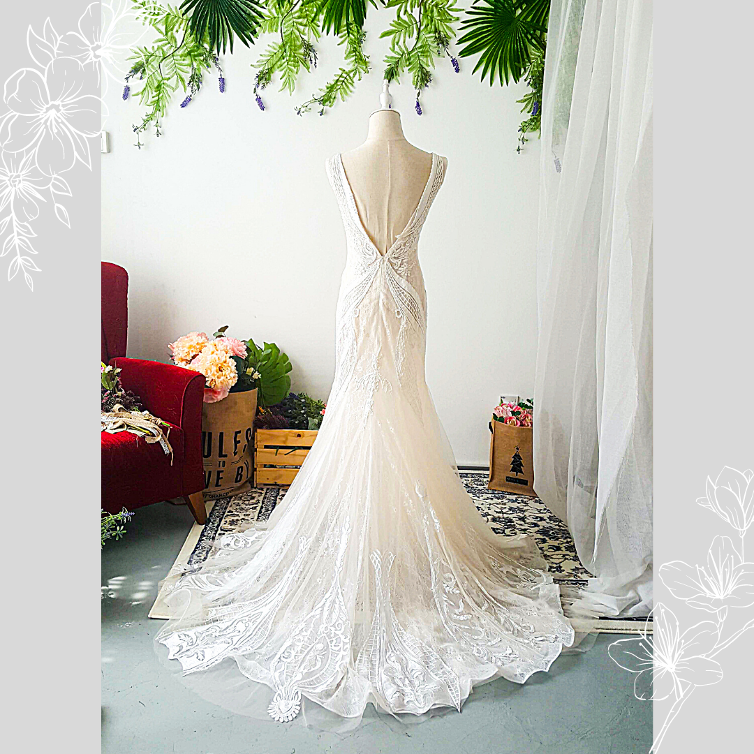 808LLW02 Sammie Deep V Spanish Guipure Deep V back trumpet mermaid bridal designer malaysia rental custom make